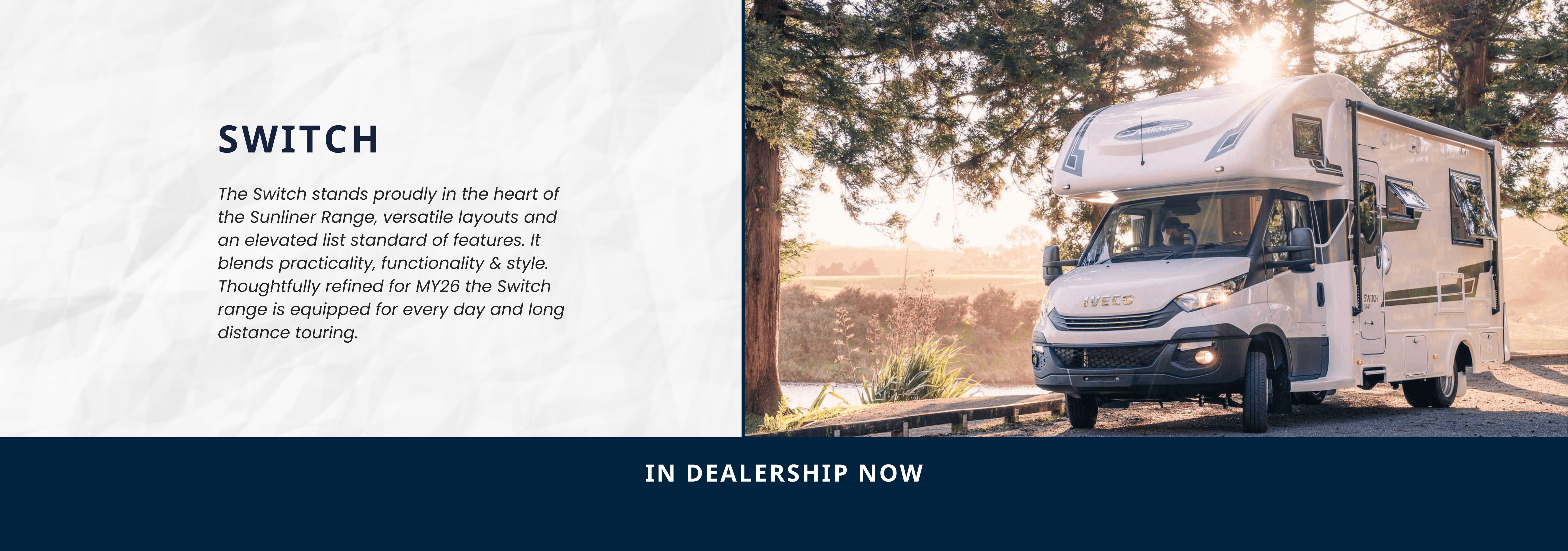 The Sunliner Switch delivers a balanced blend of comfort, practicality and smart design, positioned as the ideal mid-range touring motorhome. With nine layouts across three lengths and a wide selection of chassis options, the Switch offers versatility to suit a broad range of travellers and touring styles.