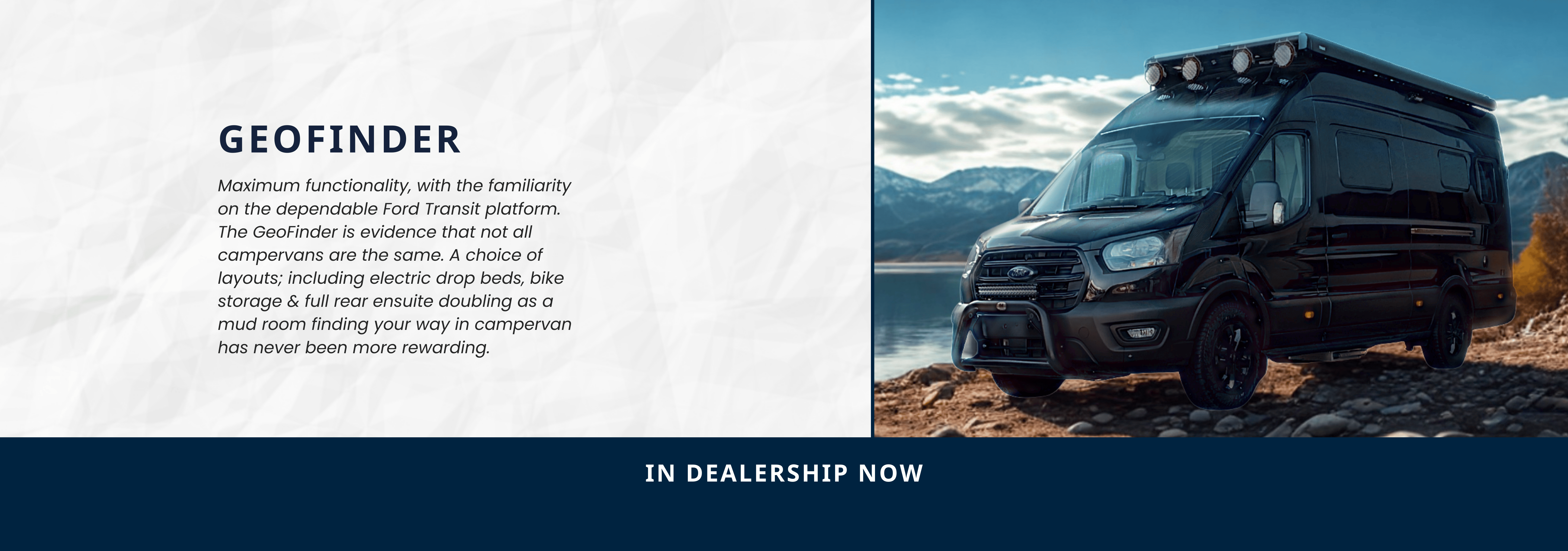 Building on Sunliner’s campervan heritage dating back to 1974, the GeoFinder embodies modern luxury touring within the dependable Ford Transit platform. Offering a choice of four versatile layouts, the GeoFinder proves that not all campervans are created equal. Options include electric drop-down beds, dedicated bike storage solutions and a full rear ensuite that doubles as a practical mud room, creating a space that adapts effortlessly to your adventures.