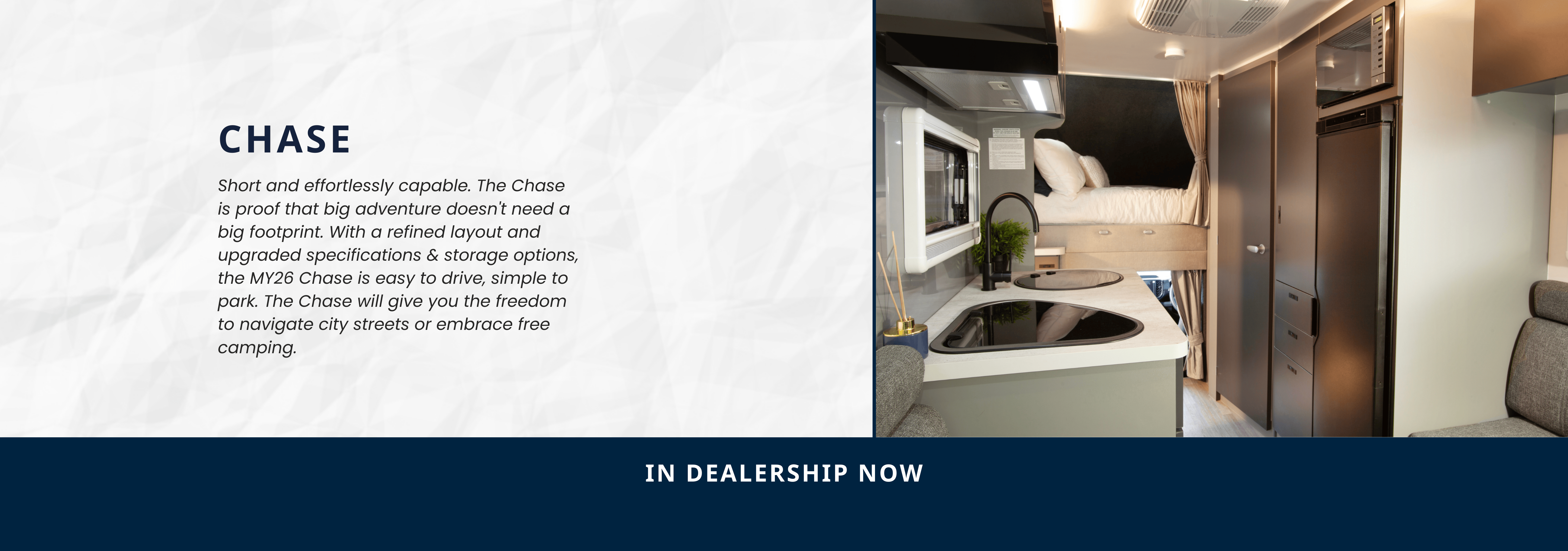 The Chase is designed for solo or twin travellers who love exploring. At home on city streets and suburban driveways, the Chase gives you the flexibility to go places where regular motorhomes can not.