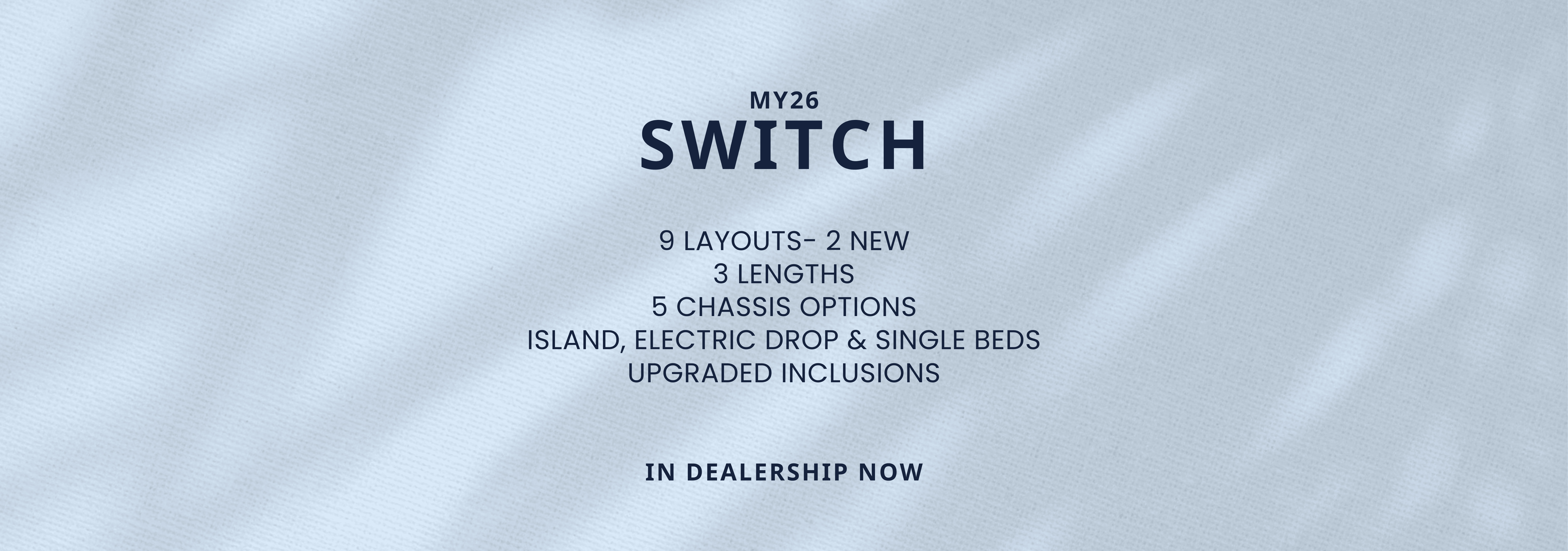 Selected layouts feature slide-out sides for expanded living space, along with electric drop-down beds to maximise functionality. The Switch’s well-equipped kitchens include hidden drawers, bench extensions, induction and gas cooking, creating an effortless, residential-style cooking experience on the road.